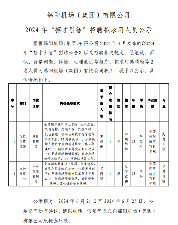 綿陽機(jī)場(chǎng)(集團(tuán))有限公司 2024 年“招才引智”招聘擬錄用人員公示